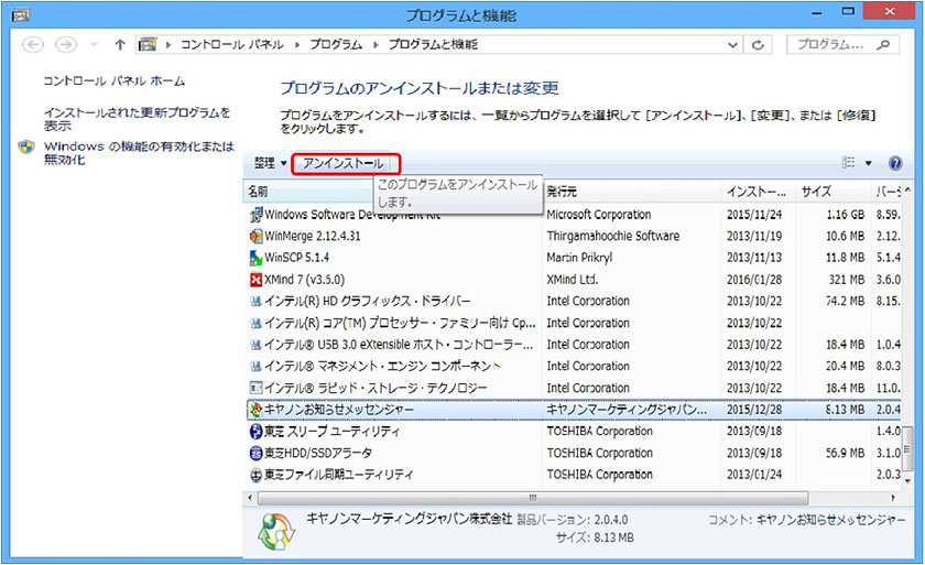 キヤノンお知らせメッセンジャーのアンインストール方法をご案内致します。