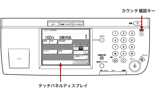(1)操作パネル上のカウンタ確認キーを押し、タッチパネルディスプレイにシリアルNo.を表示させます。