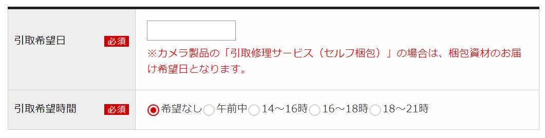 引取修理サービスの「申し込み情報入力」画面の「引取希望日」欄で、上記の表の「お申込み日」に応じた「お引き取り・梱包資材お届け可能日」の日付を選択してください。
